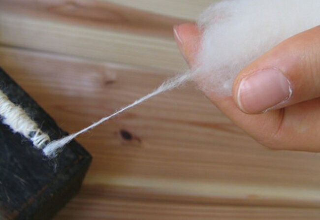 人の手で優しくつむがれていく手つむぎ糸。その原理は数千年前から変わらず。種を除き、わた打ちをして均一にほぐしたわたを、糸車を使い糸をつむいでゆきます。それは気の遠くなるような手作業で、 熟練者が丸一日休みなくつむいでも200g程度の糸が精一杯。本当に手間と根気の要る作業です。